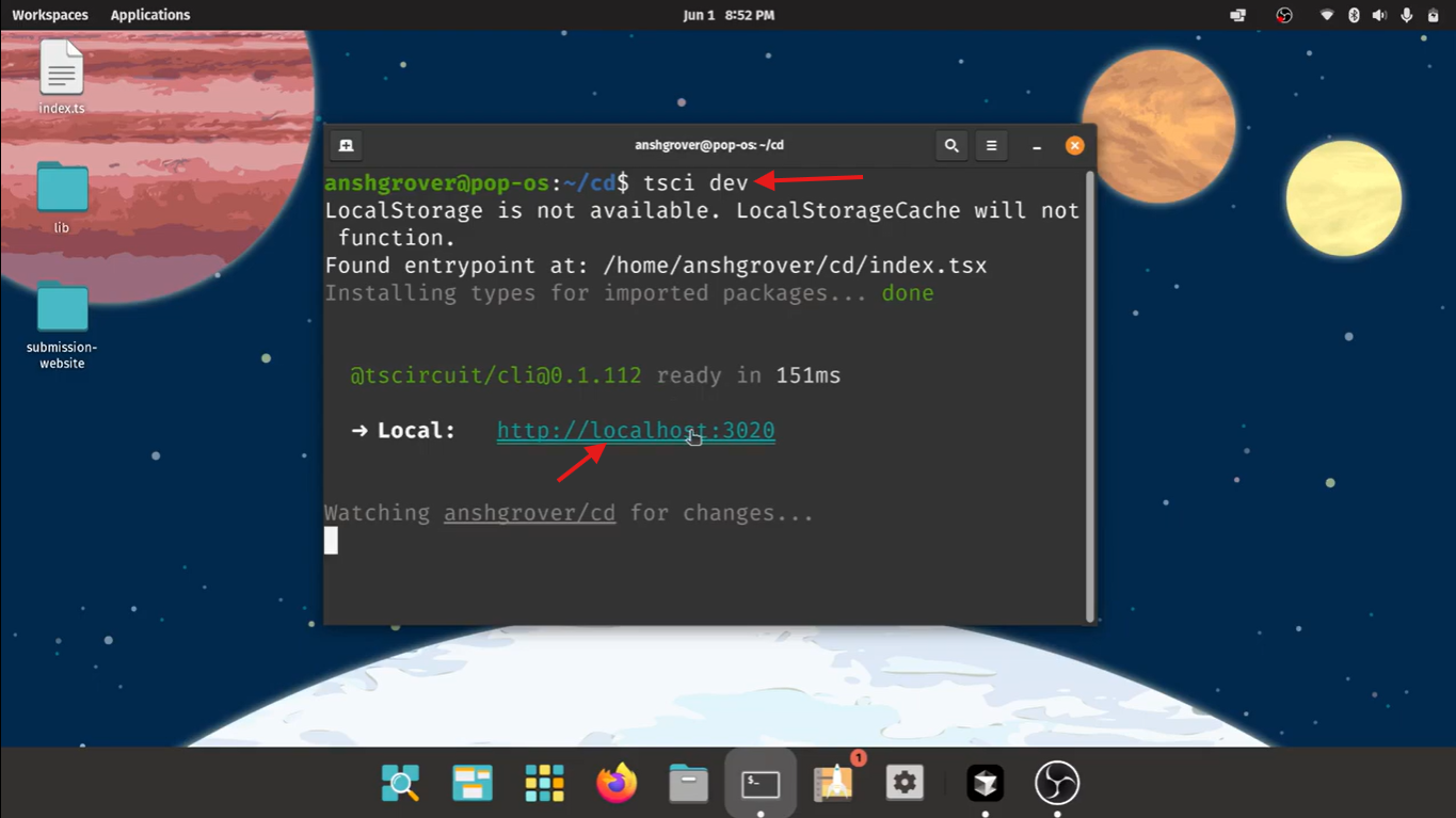 Run tsci dev to start the development server