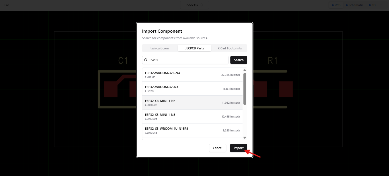 The easiest way to import JLCPCB components is using the editor's built-in import dialog when running tsci dev. This provides a modern search interface with real-time stock information.